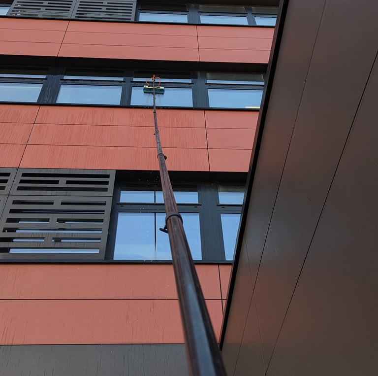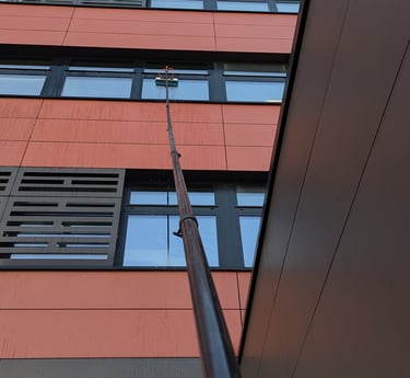 Specjalizujemy się w czyszczeniu elewacji, kostki brukowej, przeszklenia oraz pracach na wysokości z użyciem mycia ciśnieniowego.